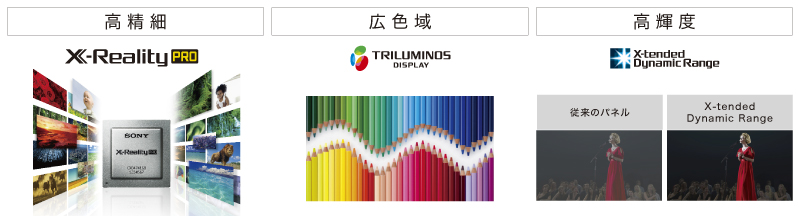 あらゆるコンテンツをリアリティー豊かに再現する超解像エンジンX-Reality PRO、色彩豊かな映像を再現するトリルミナスディスプレイに加え、つややかな輝きを実現するX-tended Dynamic Rangeを搭載。高画質3要素を追求し、プレミアムフルHDモデルとして表現力豊かな映像を再現します。