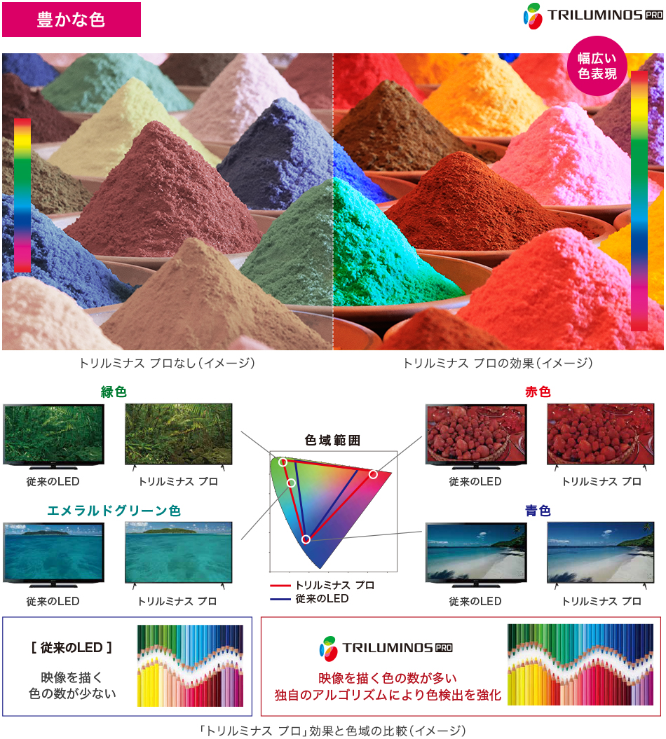 人の目に映る色は、たとえば赤といっても、バラ、紅葉、トマト、ワインなど、さまざまな赤の色合いがあります。「トリルミナス プロ」では、広い色再現領域に加えて、独自の新アルゴリズムにより、彩度/色相/明度を3次元で検出することで、より細部まで忠実な色を自然に再現することが可能になりました。これにより、今まで表現しきれなかった繊細な色のニュアンスや、人肌のみずみずしい質感までも明るく色鮮やかに描き出します。