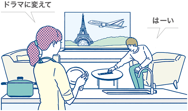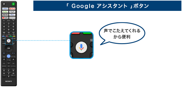 リモコンの「 Google アシスタント」ボタンを押して、会話をするように声で見たい動画を探せる「音声検索」が可能。(*)押して、話す。それだけで見たいものを検索できます。