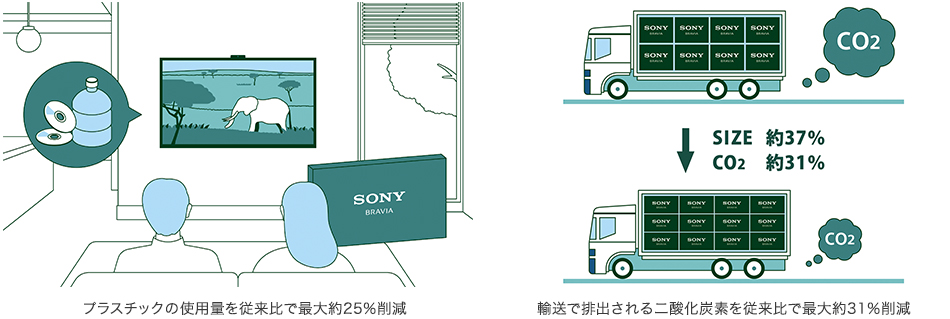 従来のパッケージでは製品の上下左右に緩衝材が配置されていましたが、長年にわたるシミュレーションの繰り返しや蓄積した物流のノウハウによって、製品保護と梱包材使用量の削減を両立できる最適な形態を導き出しました。十分な保護強度を実現しながら、プラスチック使用量を約25%(*)低減しました。また、製品を保護するパッケージを小型・軽量化するための見直しをはかり、サイズを約37%削減しました。これにより、パレット1つあたりに積載できる台数がアップし、製品1台あたりのCO2排出量を約31%(*)削減することに成功しました。