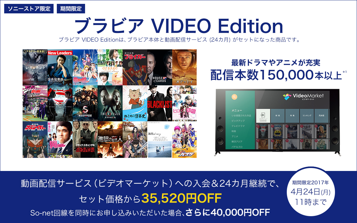 ブラビア本体と「ビデオマーケットが提供する動画配信サービス」入会、24カ月間継続と「So-net回線契約」で販売価格(税抜)から最大75,520円のセット値引が適用されます。