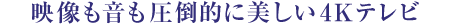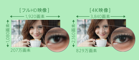 「解像度」とは、映像を構成する最小単位である「画素」の細かさのことです。この数字が大きいほど、画素の存在が気にならなくなり、映像は“現実”の見え方に近づきます。4Kテレビの解像度は、フルHDテレビのなんと4倍(829万画素)!大画面×4K解像度によるリアリティーあふれる映像は、テレビを購入する前にぜひとも体験しておきたいものです。