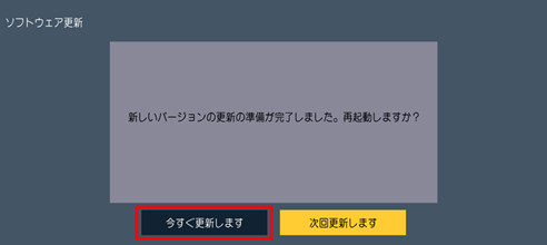 「新しいバージョンの更新の準備が完了しました。再起動しますか?」のメッセージが出ますので、[今すぐ更新します] を選び、「決定」を押します。