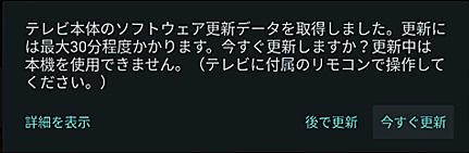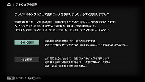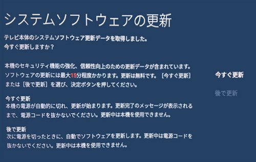 注意)直ぐに視聴を行いたい場合は「後で更新」を選択してください、この場合は次回本体の電源を入れた時に再びアップデートを促すメッセージが現れます。