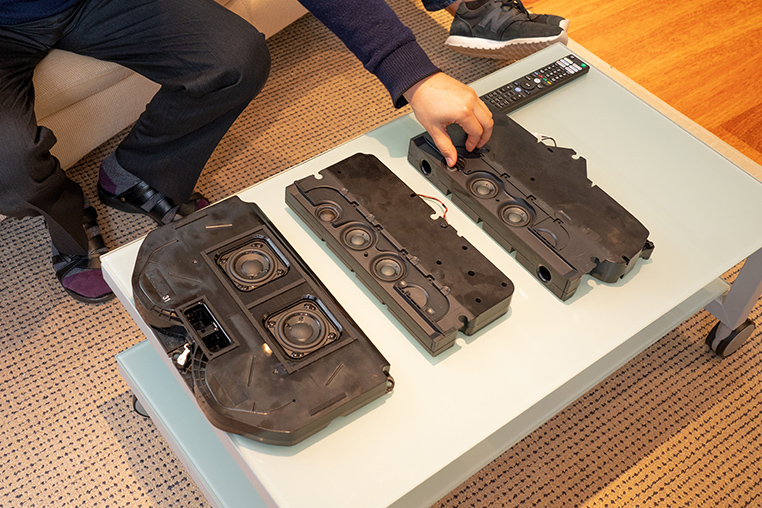 増田:従来のような下向きスピーカーでは、音が反射して視聴者の耳に届くかたちとなるため、音質がテレビ台や背後の壁の材質などに大きな影響を受けてしまうという問題があります。音のリアリティを高めるためにも、ダイレクトに音を届けられる前向き配置は必須でした。
