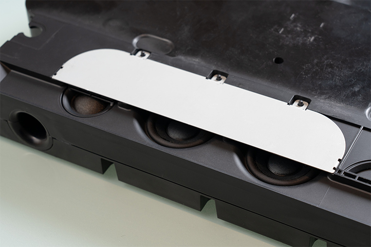増田:そうですね。ただ、それぞれのフルレンジスピーカーは45mm径のミドルレンジスピーカーを2発と、20mm径のトゥイーターを組み合わせたものになっています。ミドルレンジスピーカーはサウンドバーなどで使われるような本格的なものですし、トゥイーターもハイレゾ対応スピーカーで使われている14mm径ユニットよりも一回り大きく、よりしっかりとした高域を奏でてくれます。また、サブウーファーもそれぞれ2つのユニットから成っており、大画面に負けない迫力ある低音を出せるようにしています。