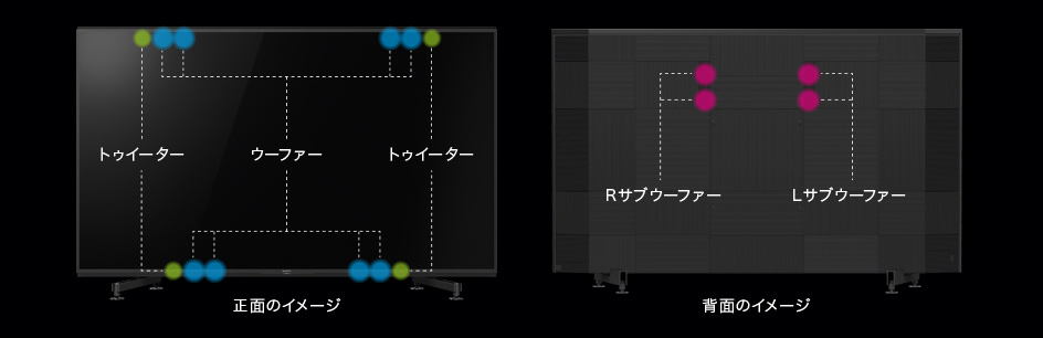 画面上部にも下部のスピーカー群と対になるようにスピーカーを配置し、背面にはサブウーファーを2基搭載