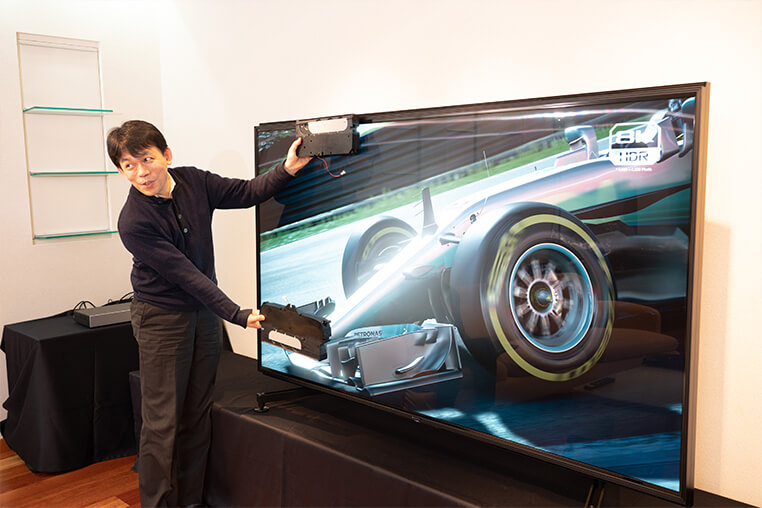 増田:8Kテレビに合った音質とはどのようなものかを考え抜いた末、85V型の大画面を誇るこの製品では、画から音が出ている感覚を大切にするべきだという結論に達しました。この「画音一体」というコンセプトは、ソニーの有機ELテレビで「アコースティック サーフェス」としてすでに実現済み。また、液晶テレビ向けにも「アコースティック マルチ オーディオ」が存在します。それが非常に好評でしたので、ブラビア「Z9H」ではこれをさらに発展させたものを搭載しています。