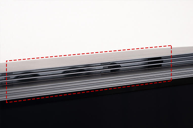 増田:ブラビア「Z9H」では、前向き配置にしたスピーカーが映像鑑賞時の視覚的なノイズにならないよう、デザイン上のアクセントにもなっているスリットの向こう側に配置するようにしています。