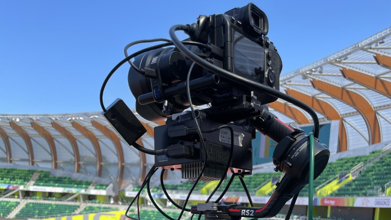 藤本:2022年の7月に地上波での陸上競技大会の中継に使用しました。東京のTBSテレビ本社からアメリカ・オレゴン州のスタジアムに設置した2台の『α7S Ⅲ』をコントロールして、伝送された4K映像をXR(エクステンデッドリアリティ)スタジオのLEDウォールに映し出す背景映像に使用しました。レンズは、スタジアム全体を約120°もの超広角で映せる『FE 12-24mm F2.8 GM』を選びましたが、周辺部までしっかり映ったキレのいい4K映像をここまでの広角で映せたのは、フルサイズイメージセンサーを搭載しているαならではの性能と思いましたし、スタジオにいらっしゃった方も、あまりの臨場感の高さにテンションが上がっていた様子でした。