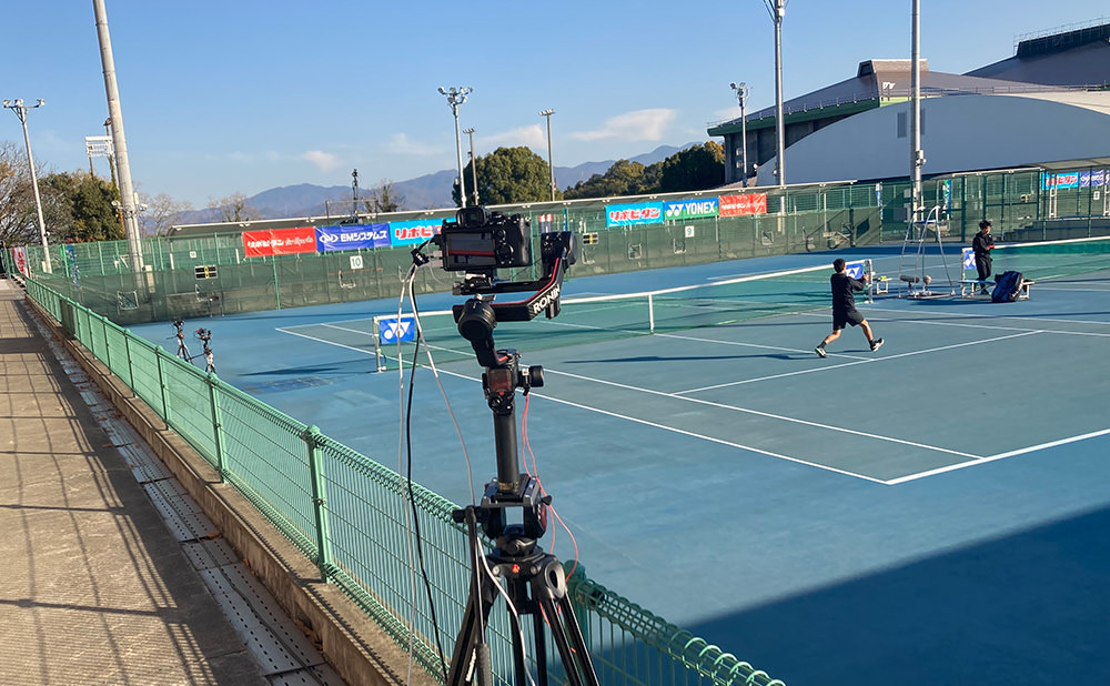また、2019年からテニスの試合のリモート撮影を実施していましたが、2022年3月の高校生テニスの全国大会の配信から、ソニーの『Camera Remote SDK』を用いた『α7 Ⅳ』と『α7S Ⅲ』による撮影に移行しました。レンズについては電動ズームに対応し、動画撮影用に作られている『E PZ 18-105mm F4 F OSS 』を使用しました。2022年12月にはCinema Line カメラ『FX30』も導入し、愛媛で開催されたテニスのジュニア大会の中継に投入しました。