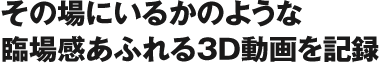 レンズ・イメージセンサーなどをダブルで搭載。右目用と左目用の映像を同時に記録して、高画質な3D動画を生成します。撮影した3D動画を3Dテレビで再生すれば、まるでその場にいるかのような臨場感を満喫できます。