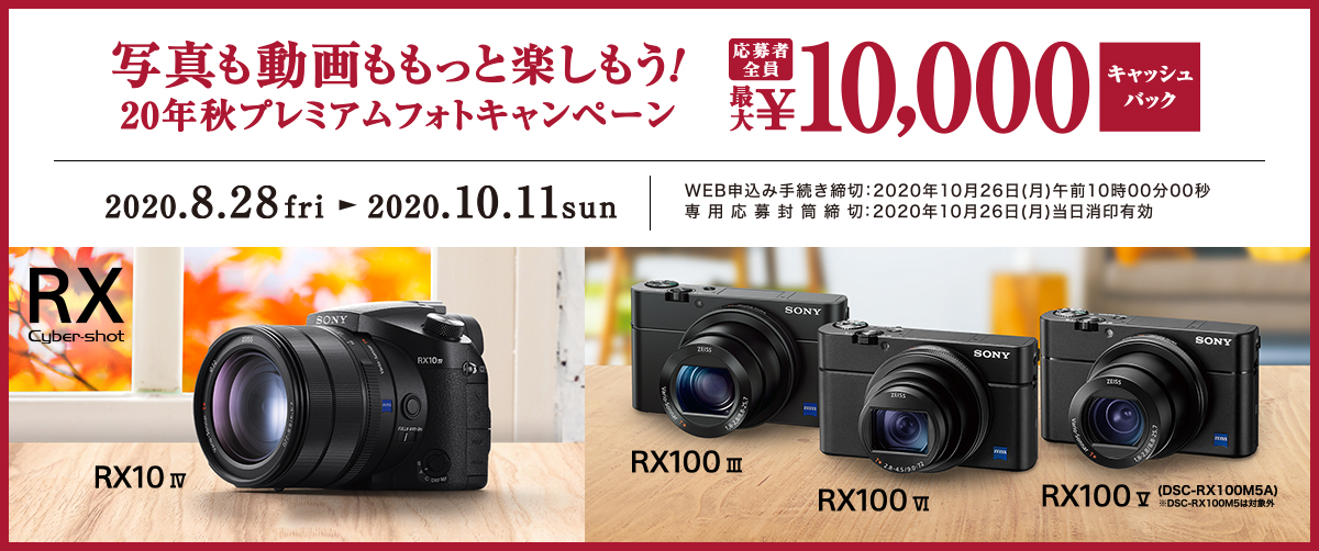 写真も動画ももっと楽しもう!20年秋プレミアムフォトキャンペーン(以下「本キャンペーン」)では、キャンペーン期間(購入期間)内に対象商品を購入し、当社指定の手続きに従い応募期間内に不備なくご応募されたお客様に、対象商品毎に定めた金額をもれなくキャッシュバックいたします。