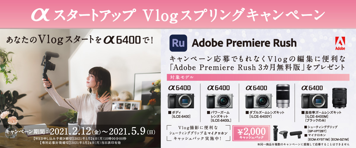 αスタートアップ Vlogスプリングキャンペーン(以下「本キャンペーン」)では、キャンペーン期間(購入期間)内に対象商品を購入し、当社指定の手続きに従い応募期間内に不備なくご応募されたお客様に、対象商品毎に定めた特典や金額をもれなくプレゼントいたします。