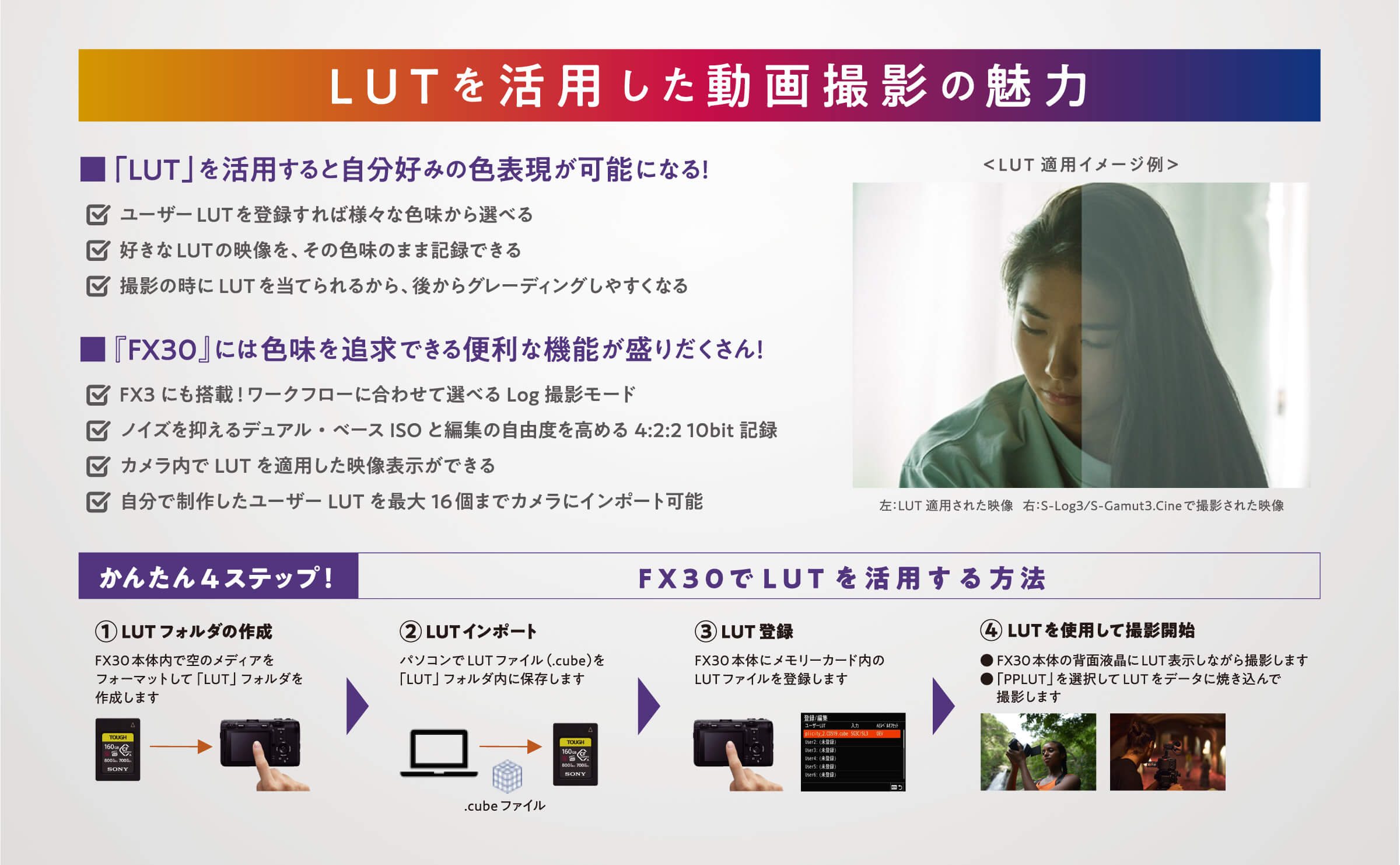 さらにキャンペーン期間内にFX30を購入した方に有名映像クリエイター計4名のLUTファイルをプレゼントいたします。