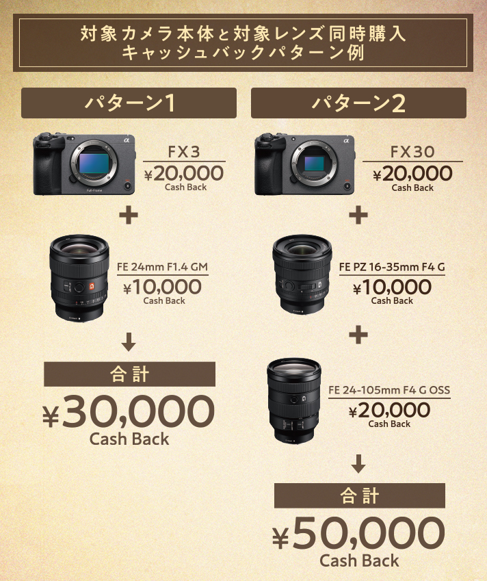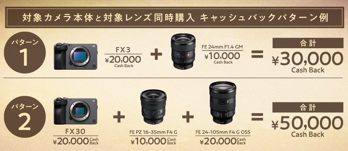 ※カメラ本体の購入と同時もしくはカメラ本体の購入後期間内にレンズを購入した場合、各金額キャッシュバック