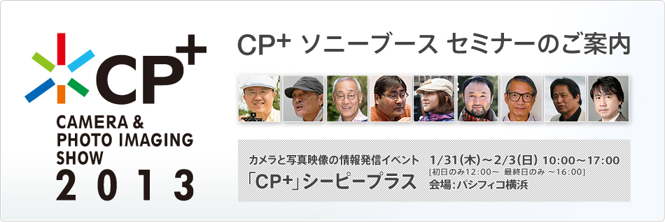 CP+ CAMERA & PHOTO IMAGING SHOW 2012 CP+ ソニーブース セミナーのご案内 カメラと写真映像の情報発信イベント 「CP+」 シーピープラス 2/9(木)〜2/12(日) 10:00〜17:00 [初日のみ12:00〜 最終日のみ 〜16:00] 会場:パシフィコ横浜 展示会場:アネックスホール