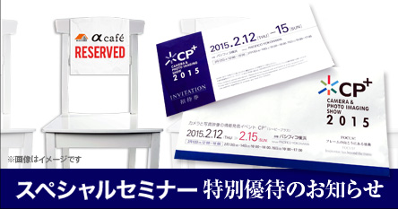 ソニーブースで開催予定のスペシャルセミナーの最前列に、αcaféユーザーを特別にご招待。 混雑が予想されるセミナー当日に、席を優先的に用意いたします。人気写真家 中井 精也氏と魚住 誠一氏のセミナーをぜひ、最前列でお楽しみください。