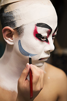 20代の兄弟は、顔(化粧)をし、衣裳をつけ拵えをする中で