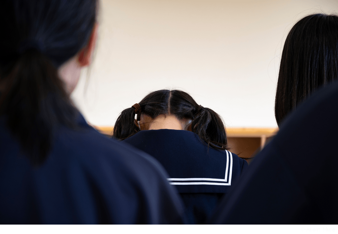 撮影中、彼女らは制服を着て周囲に溶け込み、戸惑いながらわたしとある一定の距離を保ち続けます。ぎこちない会話も続かず、ただ唯一、レンズがお互いの依り代だったように思います。このような心許ないやりとりに決着をつけようと、答えを求めたくなりましたが、意味はふらふらさせておくことにしました。彼女らは制服と皮膚が擦れるとき、身体的には自身の存在に安心し、精神的には親から与えられた輪郭との齟齬を感じているようでした。