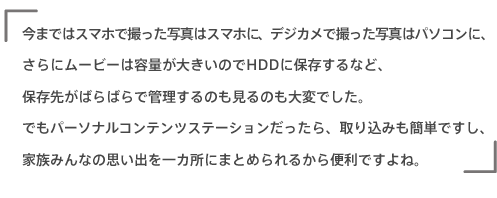 今まではスマホで撮った写真はスマホに、デジカメで撮った写真はパソコンに、さらにムービーは容量が大きいのでHDDに保存するなど、保存先がばらばらで管理するのも見るのも大変でした。でもパーソナルコンテンツステーションだったら、取り込みも簡単ですし、家族みんなの思い出を一カ所にまとめられるから便利ですよね。
