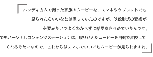 ハンディカムで撮った家族のムービーを、スマホやタブレットでも見られたらいいなとは思っていたのですが、映像形式の変換が必要みたいでよくわからずに結局あきらめていたんです。でもパーソナルコンテンツステーションは、取り込んだムービーを自動で変換してくれるみたいなので、これからはスマホでいつでもムービーが見られますね。