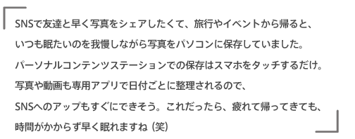 SNSで友達と早く写真をシェアしたくて、旅行やイベントから帰ると、いつも眠たいのを我慢しながら写真をパソコンに保存していました。パーソナルコンテンツステーションでの保存はスマホをタッチするだけ。写真や動画も専用アプリで日付ごとに整理されるので、SNSへのアップもすぐにできそう。これだったら、疲れて帰ってきても、時間がかからず早く眠れますね(笑)
