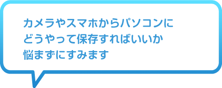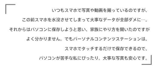 いつもスマホで写真や動画を撮っているのですが、この前スマホを水没させてしまって大事なデータが全部ダメに・・・。それからはパソコンに保存しようと思い、家族にやり方を聞いたのですがよく分かりません。でもパーソナルコンテンツステーションは、スマホでタッチするだけで保存できるので、パソコンが苦手な私にぴったり。大事な写真も安心です。