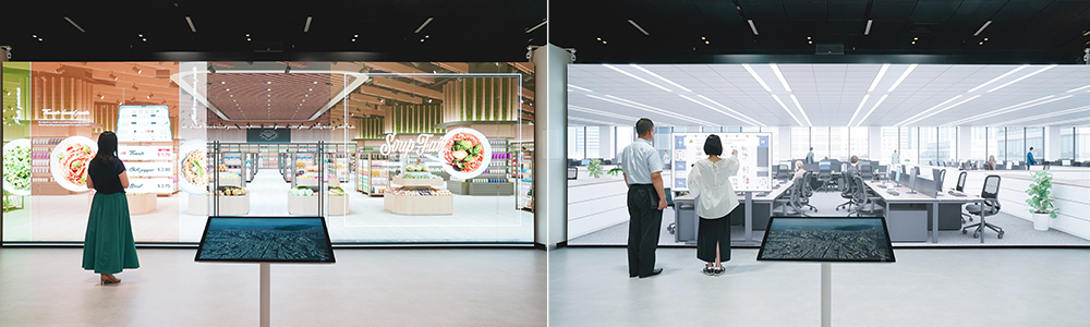 この展示では、美しい映像を映し出すだけでなく、目の前に見えている映像の奥にさらに世界が広がっているかのように感じさせる、高い臨場感と立体感、奥行き感のあるディスプレイが不可欠でした。たとえば、スーパーの入り口に設置するインタラクティブサイネージとして、おすすめのレシピを表示し、レシピに近づくと食材が置いてある位置へ案内してくれたり、またオフィスでは1人で集中できる場所や空いている会議室がひと目でわかるなどのソリューションを、等身大の大画面によってあたかも実際にその場にいるかのような臨場感のある映像で体験いただけるものとなっています。