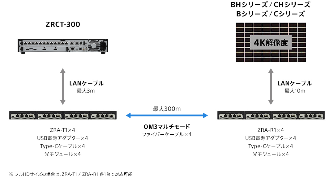 通常のディスプレイキャビネットとコントローラーをLANケーブル(CAT7)で接続した場合は10mの通信制約がありましたが、ZRA-T1 / ZRA-R1を使用することで300mまで延長が可能になります。