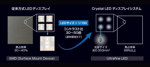 極めて微細なLED素子とその集積化によって1,000,000:1以上の高コントラスト比を実現しました。LED素子が1画素に占める割合はわずか1%未満で、残りの99%以上を黒いエリアが占める事で、画素単位で点灯・消灯を制御できる自発光制御とも相まって、漆黒を再現するその映像からは、非常に奥行き感のあるリアリティを堪能する事ができます。