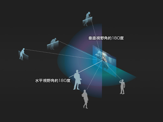 通常のLEDは、指向性が高く前方に光を出す特性があるため、斜めから見る際にはどうしても影ができてしまいます。Crystal LEDディスプレイシステムでは、RGBの光がそれぞれ四方八方に均一に放出されるよう工夫しており、どの角度でも画が破綻しません。また一般のLEDでも起こりやすい「カラーシフト」と言われる変色も起こらない「視野角ほぼ180度」を実現しました。上下・左右どの位置から見ても映像を鮮明に見ることができます。
