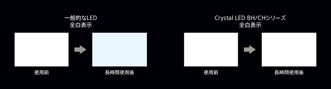 一般的なLEDはLEDの特性上、映像を表示し続けると変色が起こりうるものの、Crystal LED BH / CHシリーズは、使用時間に関わらず、常に一定の色を表示するように、独自アルゴリズムによる補正を行っております。