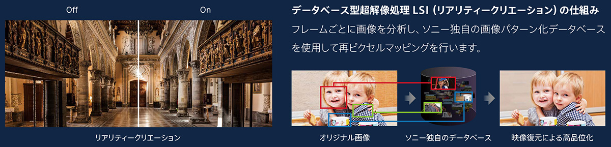 画面に合わせた超解像処理を行うことで、さまざまなコンテンツをよりリアルに表現する「リアリティークリエーション(*)」機能により、自然で美しい映像を映し出します。