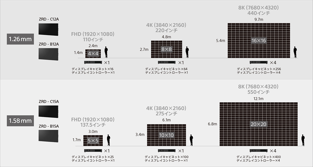 キャビネットを組み上げて大画面を構築します。C シリーズ、B シリーズ共に1.26mm / 1.58mmのピッチサイズを用意し、使用用途や設置場所に合わせて、画面の大きさや縦・横比率を自由に構成できます。さらにキャビネットにはベゼル(縁)がないので、繋げて設置すると、一枚の大画面に映し出しているような臨場感ある映像になります。