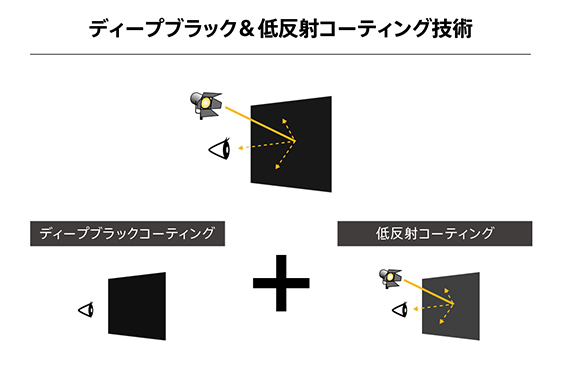 従来のディープブラックコーティングと低反射コーティングの特性を併せ持つ、「ディープブラック&低反射コーティング技術」を新開発。深く引き締まった黒の表現と照明の影響を抑えた低反射を両立しています。