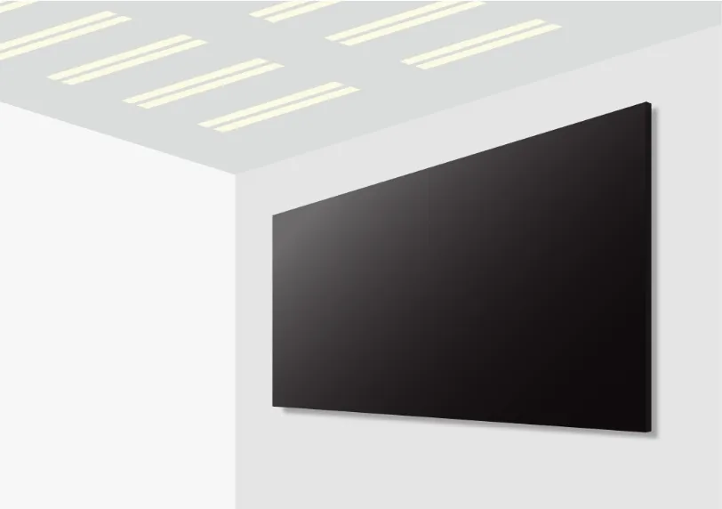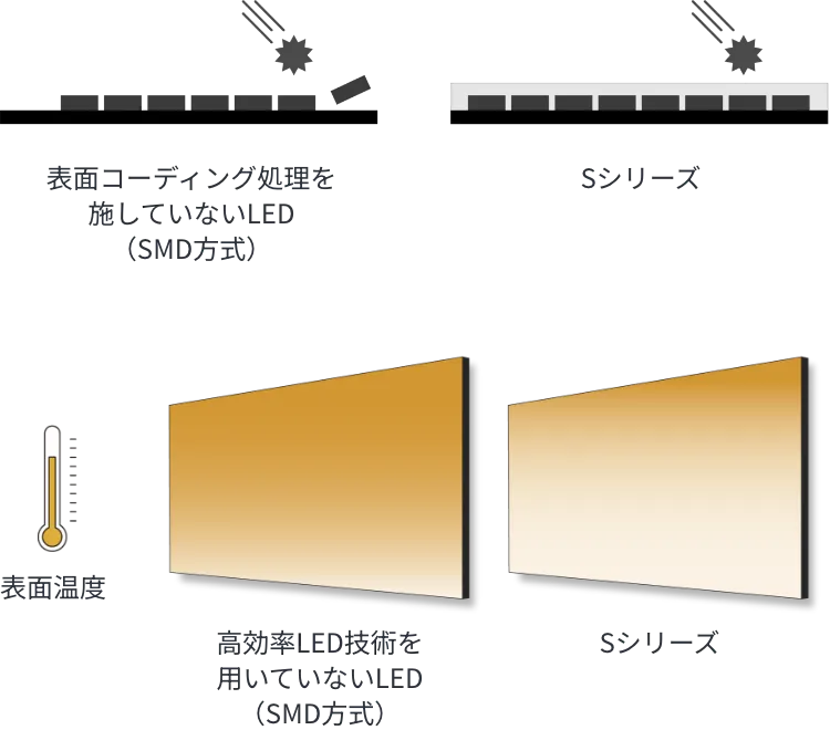 LEDチップには表面コーティング処理を施し、外部からの衝撃や静電気などによる故障を防止。会議室やエントランスなどの空間でも安心して使用できます。また、高効率LED技術によって低消費電力を実現し、運用コストの低減。電力効率の高さから表面温度の上昇も抑え、冷房費用の抑制にも貢献します。