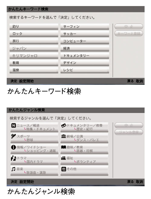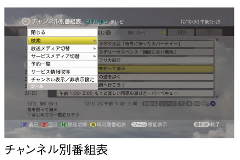 地上デジタル、BS・110度CSデジタル放送の電子番組表(EPG)に対応。独自のジャンル検索やキーワード検索機能により、豊富なチャンネルから気になる番組を素早く探すこともできます。