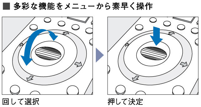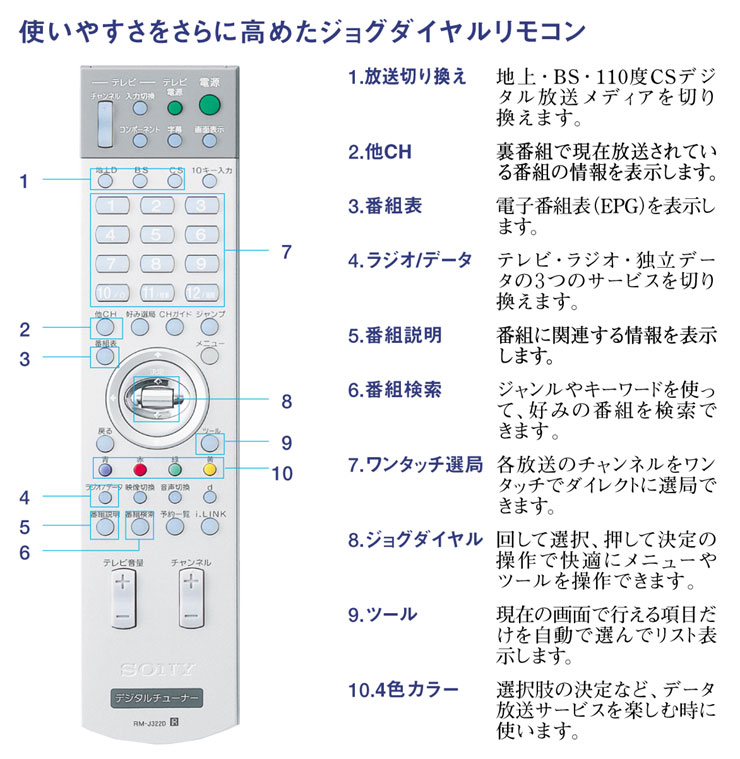 付属のリモコンには、回して選択、押して決定のシンプル操作が可能なジョグダイヤルを搭載。電子番組表やメニュー項目などはスクロール表示で選択でき、画面を見たまま直感的な操作でデジタル放送を楽しめます。