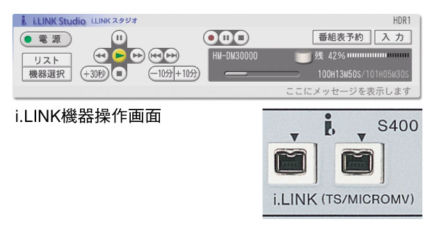デジタルハイビジョンの高画質映像をデジタルのまま、録画/再生できるi.LINK端子を装備しました。i.LINK端子なら映像・音声の録画だけでなく、デジタルレコーダーの操作もチューナー側から行えます。もちろん、番組の録画設定も電子番組表(EPG)で予約を行うだけで自動的に留守番録画が行われます。