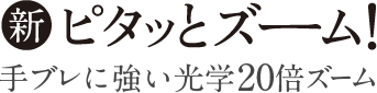 光学20倍ズーム搭載。進化した光学式手ブレ補正で小さな手ブレも検出し、高精度に補正。さらに補正効果が向上し、高倍率ズームで起こりやすい手ブレに従来比約2倍*1強くなりました。また、最速0.14秒*2の高速AFで撮りたい瞬間を逃さず撮影できます。