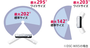 撮影角度(撮影サイズ)は上下左右ともに、標準サイズとワイドサイズから選択可能。たとえば、左右方向のワイドサイズを選べば、最大295度(*)(DSC-WX5使用時)のパノラマ写真を撮影できます。