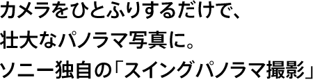 今までのパノラマ写真のイメージをガラリと変える、ソニー独自の「スイングパノラマ」機能。撮りたい景色に向かってカメラをひとふりするだけで、人間の視野を超える最大295度(*1)(DSC-WX5使用時)のパノラマ写真が撮影できます。この画期的な機能を実現したのは、ソニーが誇る先進の画像処理性能。カメラを振る間に最大100枚の静止画を高速連写し、約1秒間で各画像をつなぎ合わせて1枚のパノラマ写真に合成(*2)。スイング時に発生する手ブレ、合成時に起こる画像間のズレも高精度に補正し、美しいパノラマ写真に仕上げます。さらに、DSC-WX5・TX9・TX7・TX5・HX5Vは「顔・動き検出」に対応し、人物をよりキレイに再現するパノラマ撮影が可能。サッと振るだけの手軽さで、アッとおどろくパノラマ写真に。ソニーの「スイングパノラマ」をぜひ体験してください。