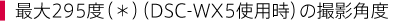 *DSC-TX9は最大281度、DSC-T99/DSC-T99Dは最大265度、DSC-HX5Vは最大270度、DSC-TX7は最大258度、DSC-TX5は最大258度、DSC-H55は最大244度、DSC-W380は最大260度、DSC-W350/DSC-W350Dは最大268度、DSC-TX1は最大185度、DSC-HX1は最大224度