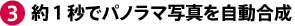 スイングする間に高速連写された最大100枚の画像を、短冊状につなぎ合わせてパノラマ写真を合成。各画像間のズレも補正するので、つなぎ目が自然な美しいパノラマ写真に仕上がります