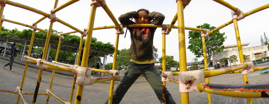 ジャングルジムの真ん中に、カメラをセットして撮影。このように近い被写体をグルッと撮影すると、パノラマ写真の臨場感がすぐに実感できます。