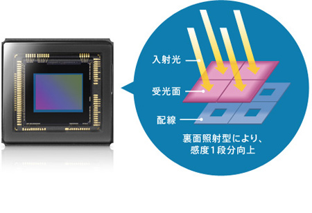 裏面照射型CMOSセンサー Exmor Rは、ソニー独自開発の「裏面照射技術」によって、コンパクトカメラの課題であった受光感度を改善。従来モデルに比べ約2倍(*)の高感度を実現しました。有効約2040万画素の描写力と相まって、夜景や室内など暗いシーンでも、ひときわ美しい写真を撮影できます。
