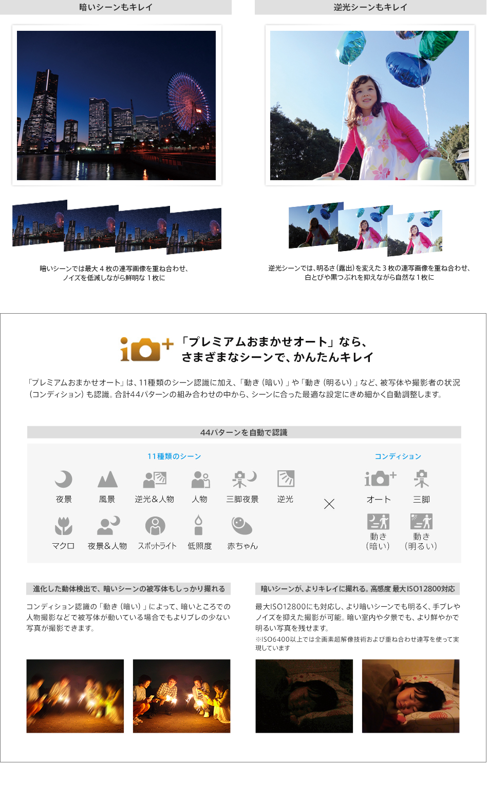 * ISO6400以上では、全画素超解像技術および重ね合わせ連写を使って実現しています