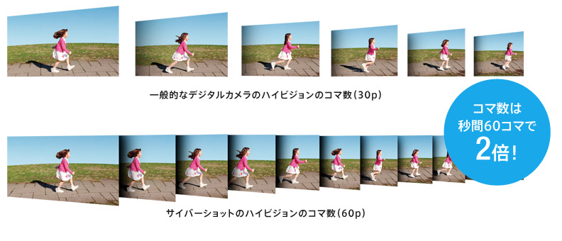 一般的なデジタルカメラのハイビジョン動画(30p)に比べ、コマ数が2倍(60p)。動きの速い被写体も、よりなめらかな映像で美しく撮影できます。
