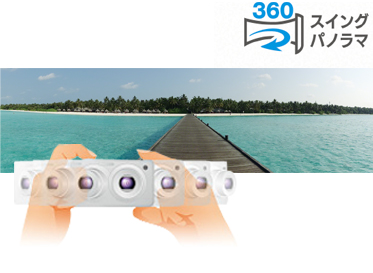 カメラをひとふりして、パノラマ写真を撮影できる「スイングパノラマ」を搭載。さらに「360スイングパノラマ」を選べば、周囲に広がる景色を360度撮影することもできます。顔・動き検出にも対応し、パノラマ写真中の被写体が動いても、きれいに補正します。
